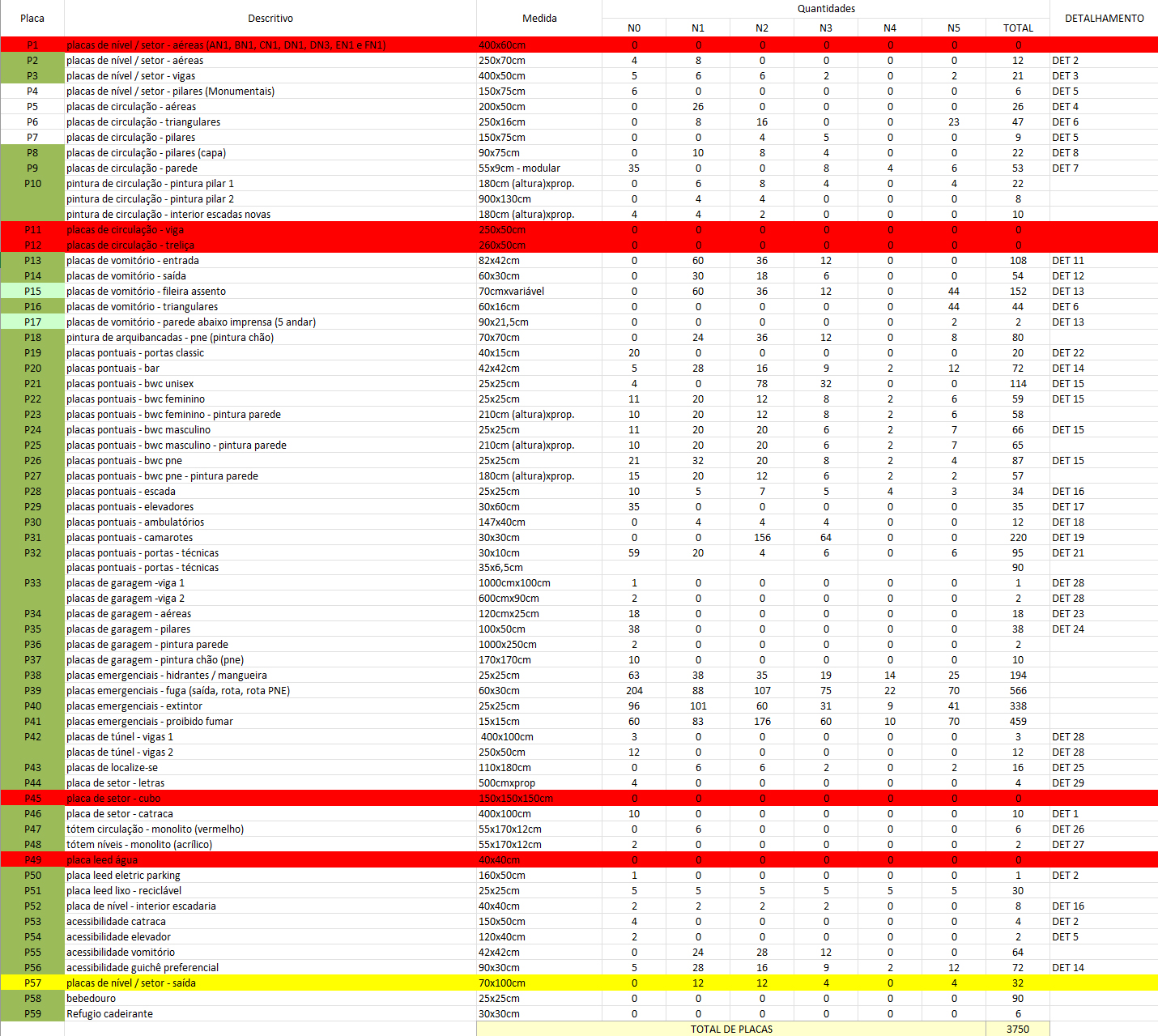 Diversidade de tipologias: A família de sinalização contou com quase 60 tipos diferentes de placas (de P1 a P59) . O inventário incluiu desde peças aéreas de 4 metros para vigas até placas modulares de 55x9cm para circulação interna.
