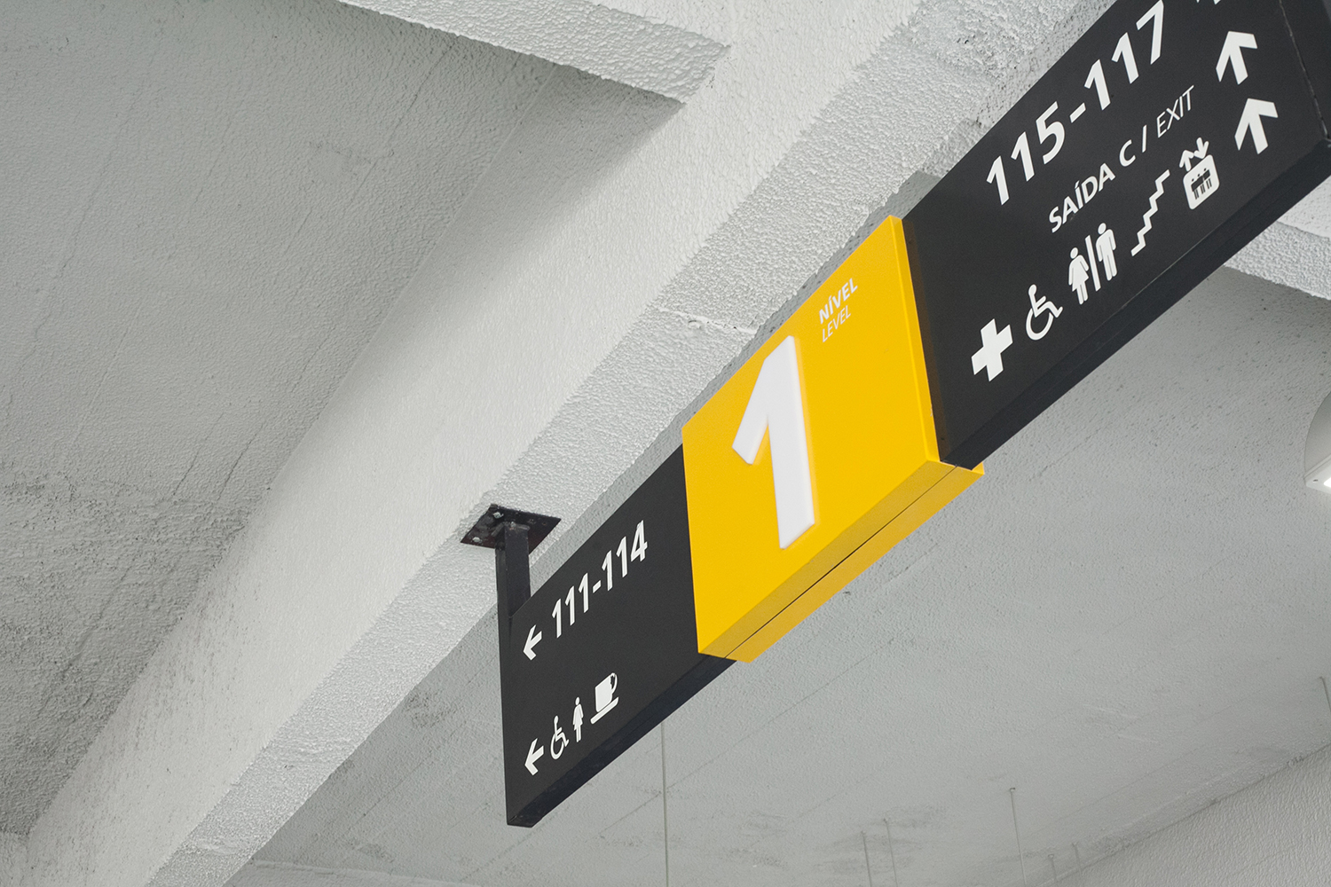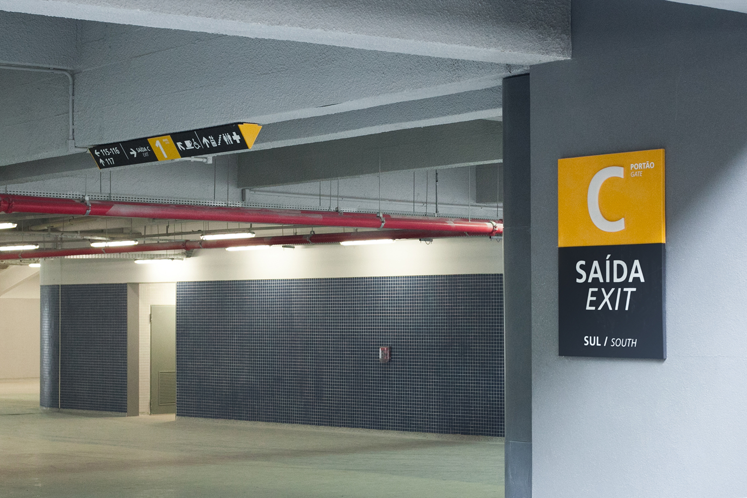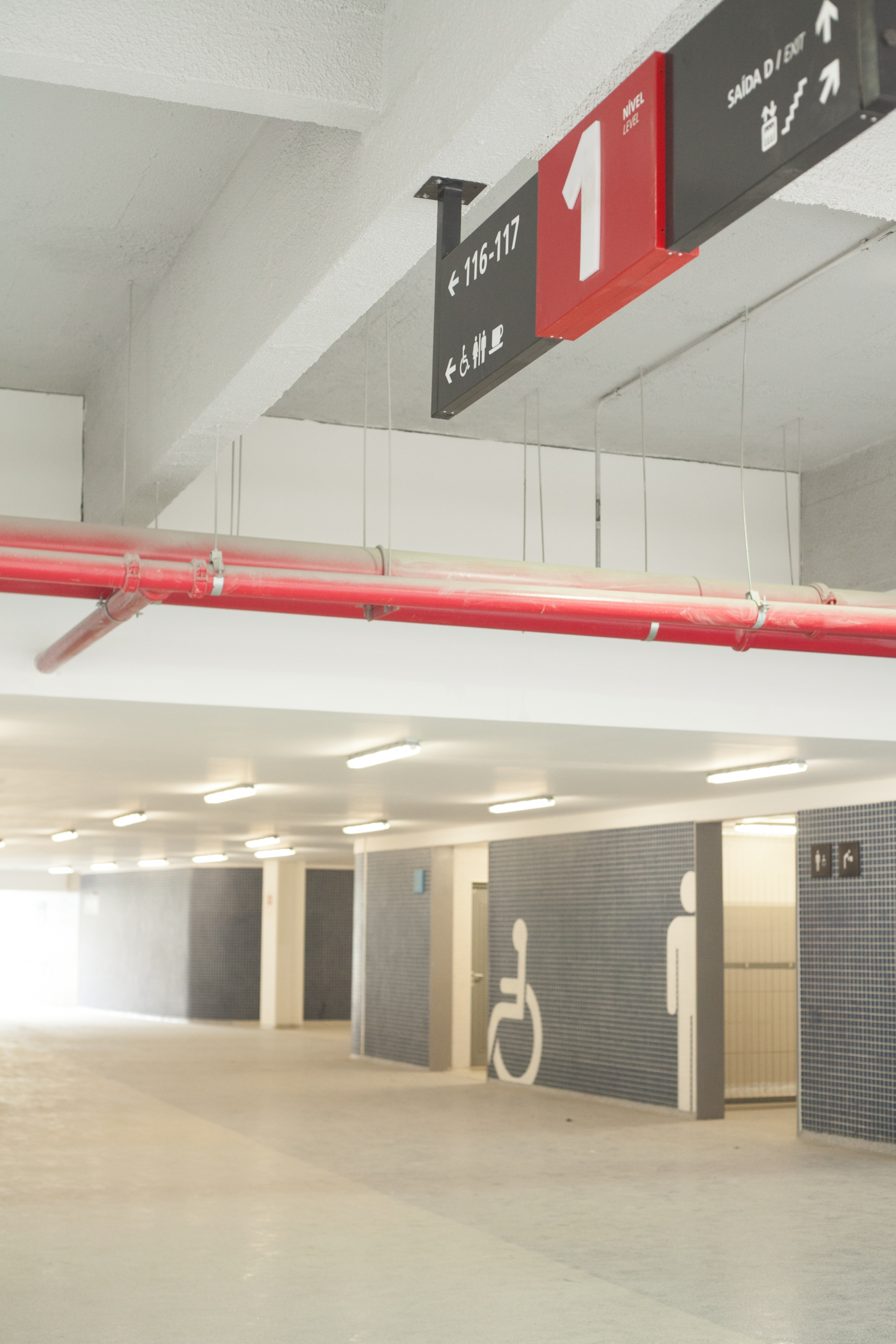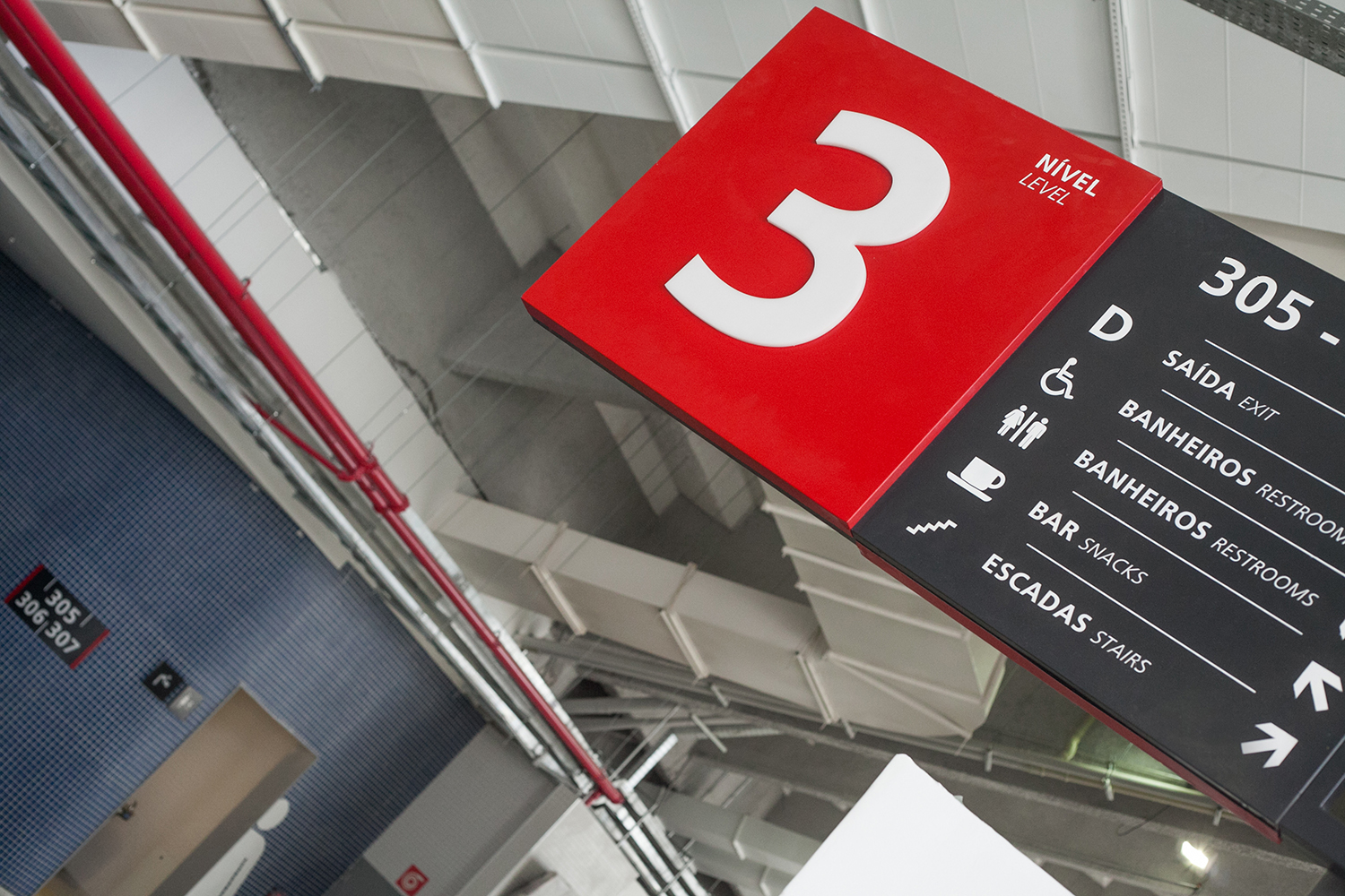 Soluções de visibilidade no nível 5: A dificuldade de sinalização em certos blocos do quinto nível foi solucionada com o uso das paredes externas do espaço de imprensa para a criação de sinalizações no formato de pilar.