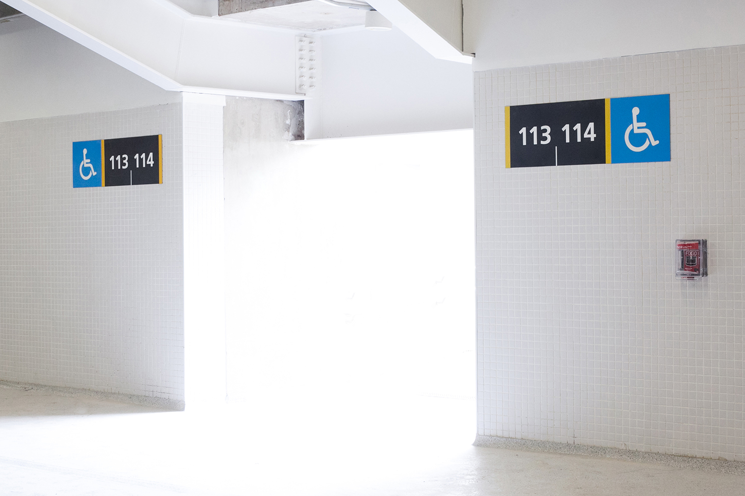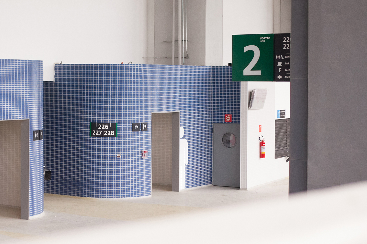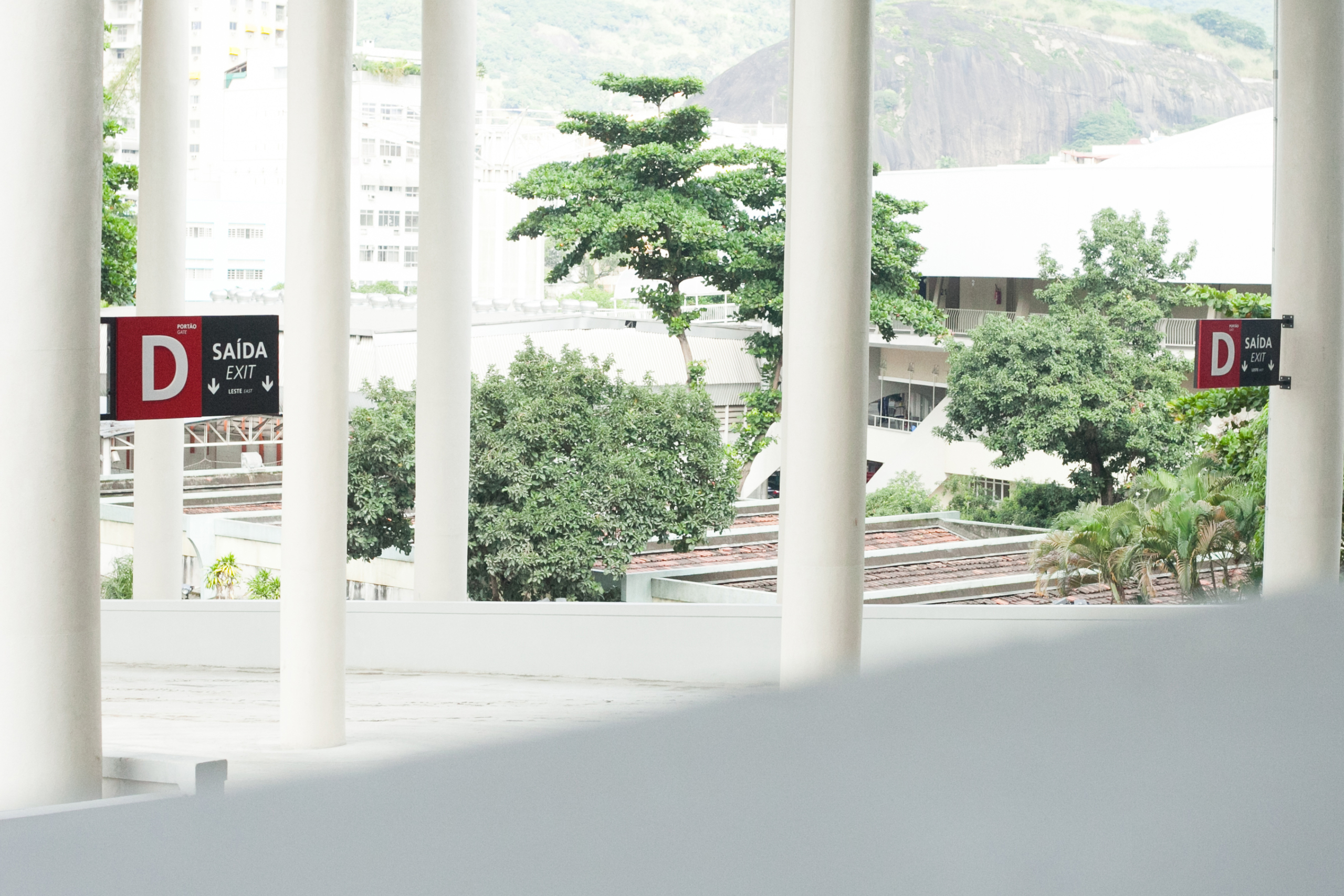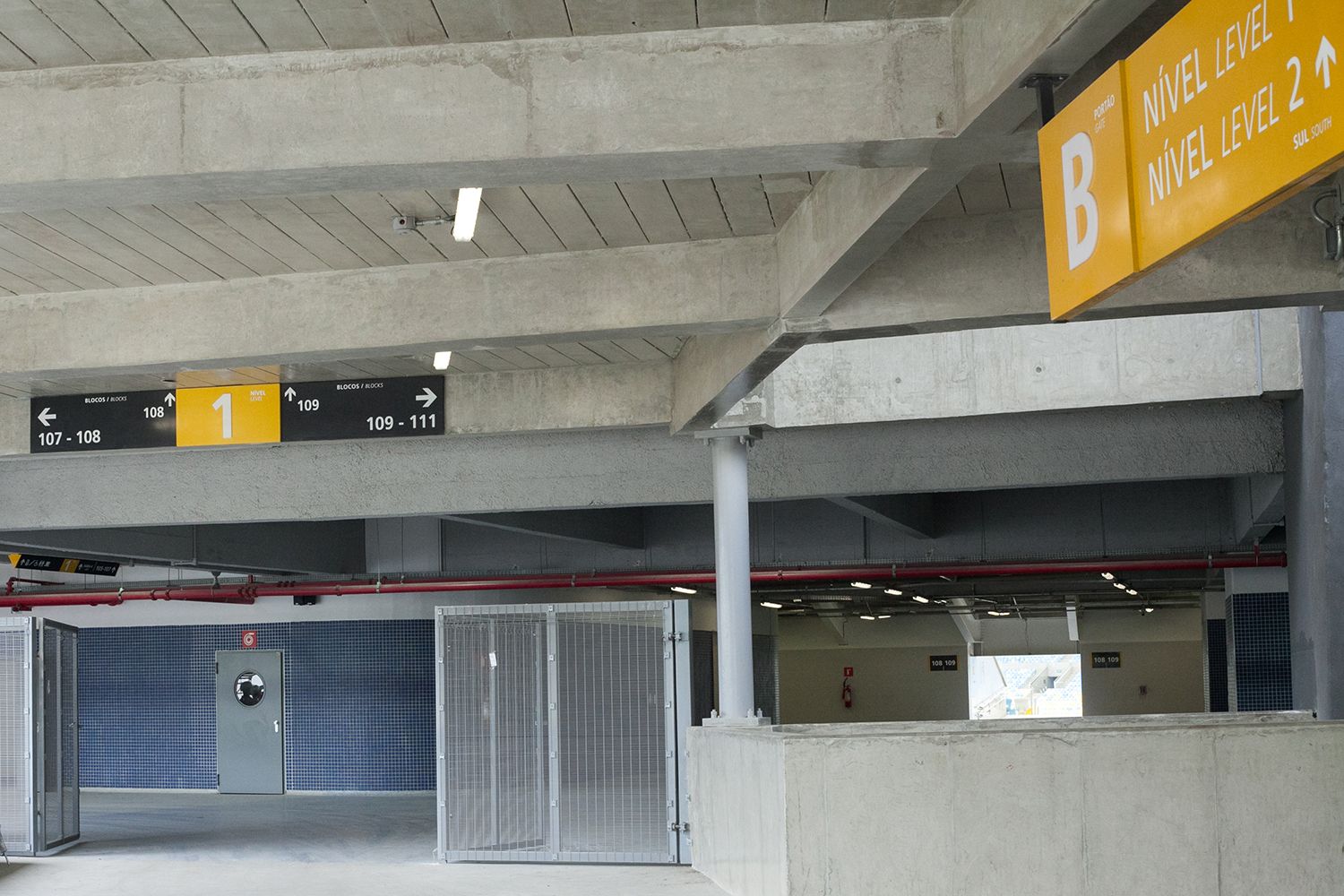 Soluções de visibilidade no nível 5: A dificuldade de sinalização em certos blocos do quinto nível foi solucionada com o uso das paredes externas do espaço de imprensa para a criação de sinalizações no formato de pilar.
