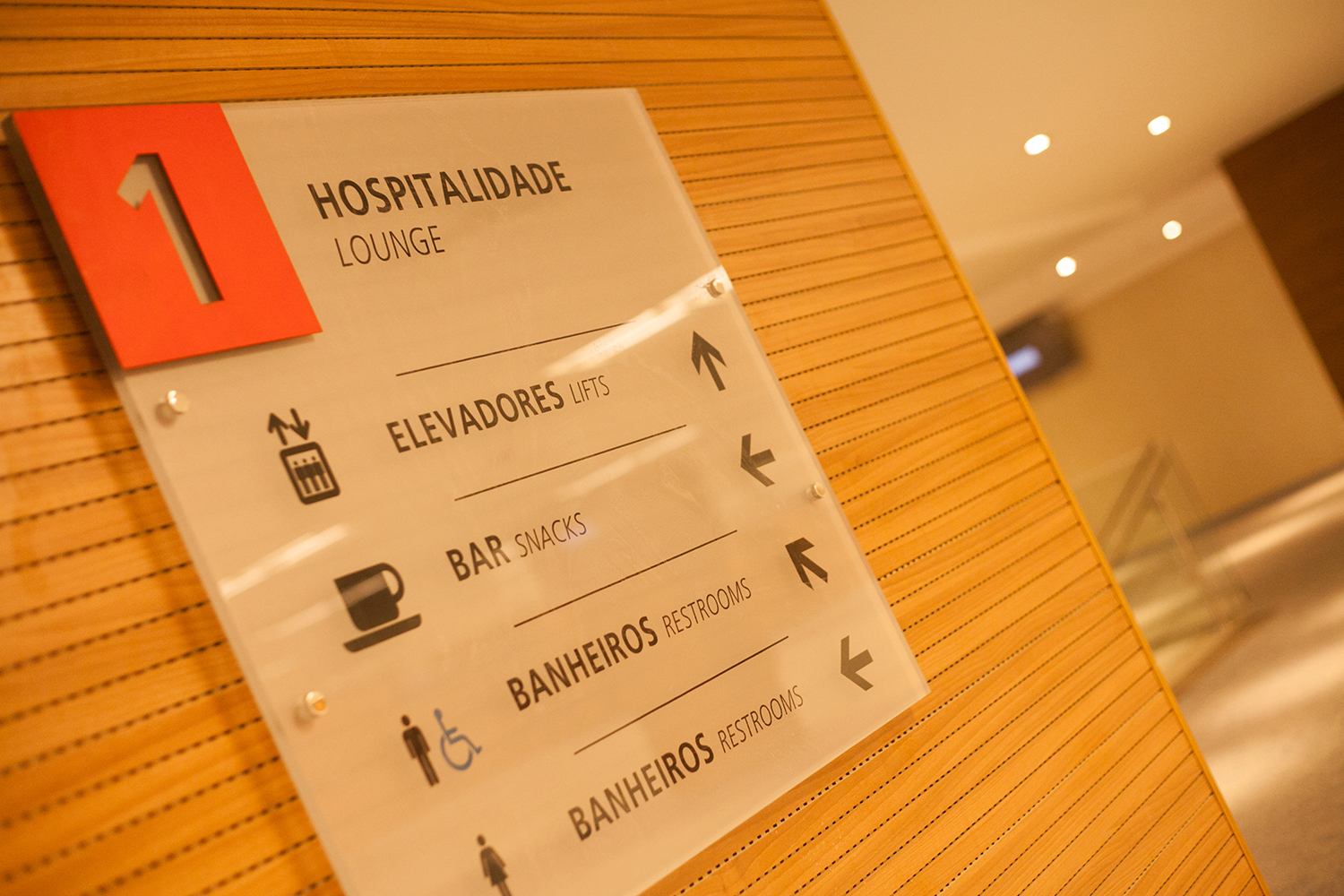 Refinamento de materiais: Em áreas de hospitalidade, o projeto previu a substituição de chapas metálicas por acrílico, garantindo que a sinalização mantivesse a sofisticação exigida para os ambientes internos como os camarotes.